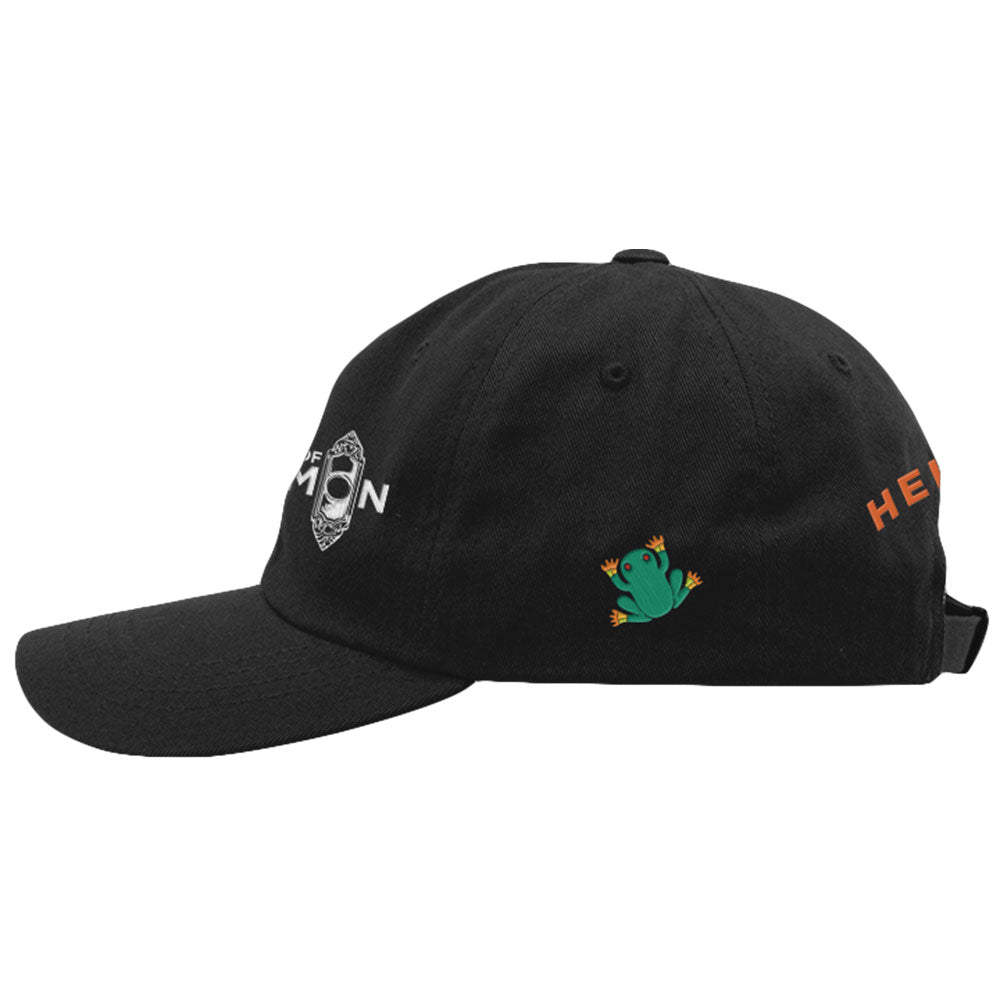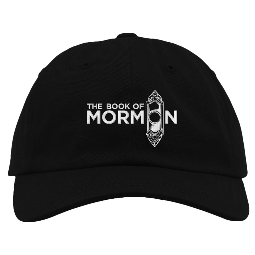A black adjustable hat featuring The Book of Mormon musical logo on the front, the frog on the side, and hello in orange on the back.
