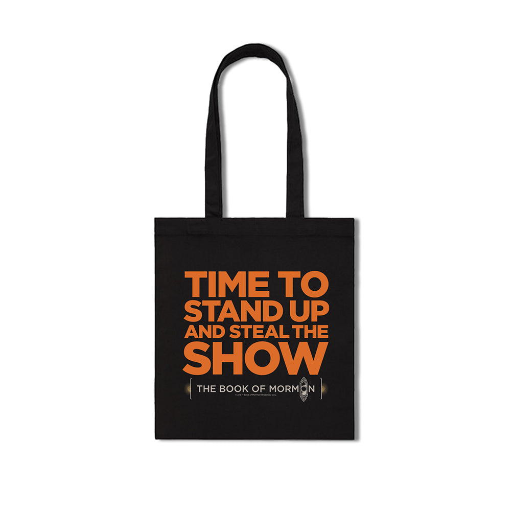 Man up with this tote bag featuring the quote, "Time to stand up and steal the show" and The Book of Mormon Logo.