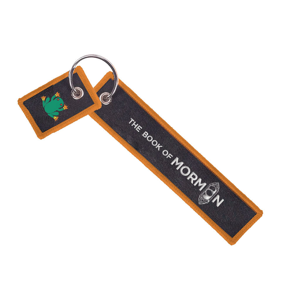 A black woven keychain with orange border featuring the Book of Mormon logo and frog.